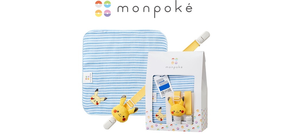 帶有色織邊框的二重紗布(播州織)手巾仔和印有比卡超臉的夾子套裝。