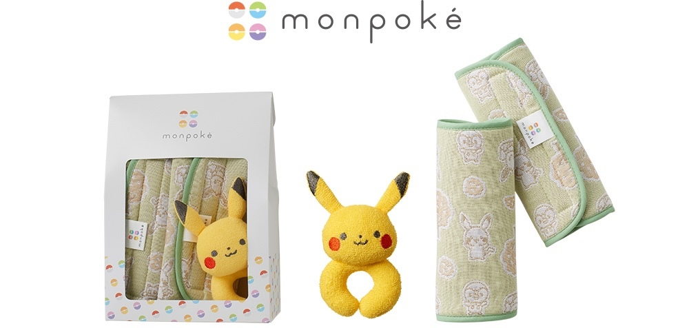 可愛的Pokemon圖案的三重紗布(播州織)嬰兒背帶腰帶套和比卡超布製撥浪鼓套裝。